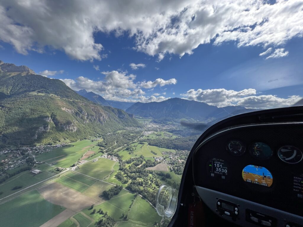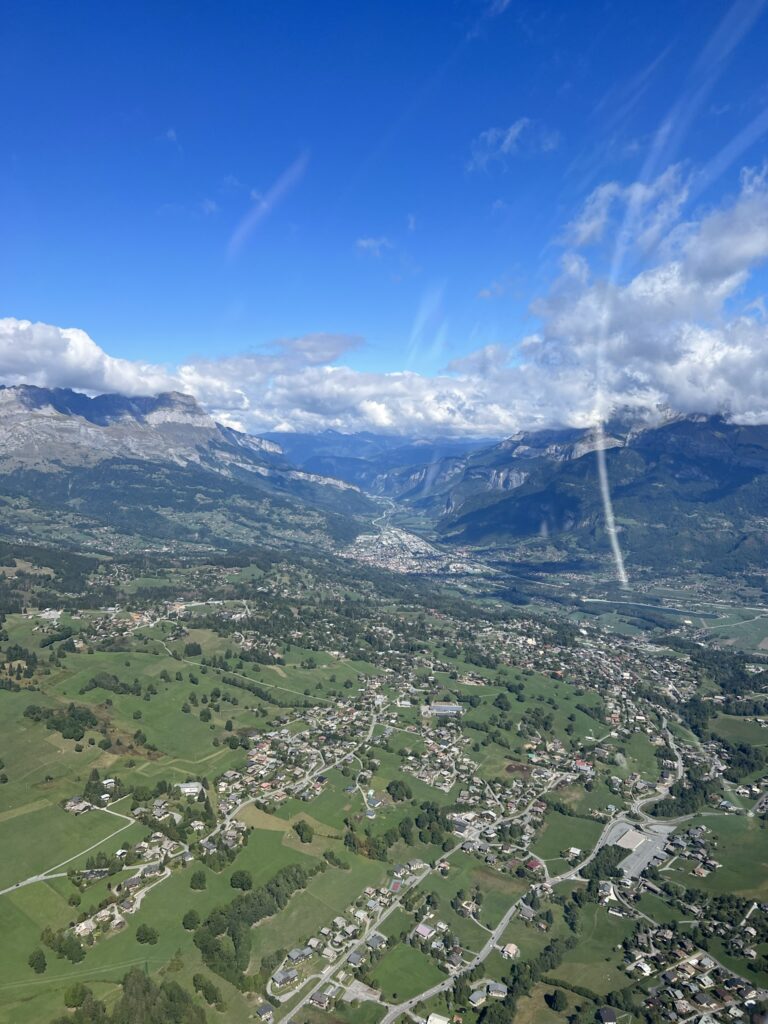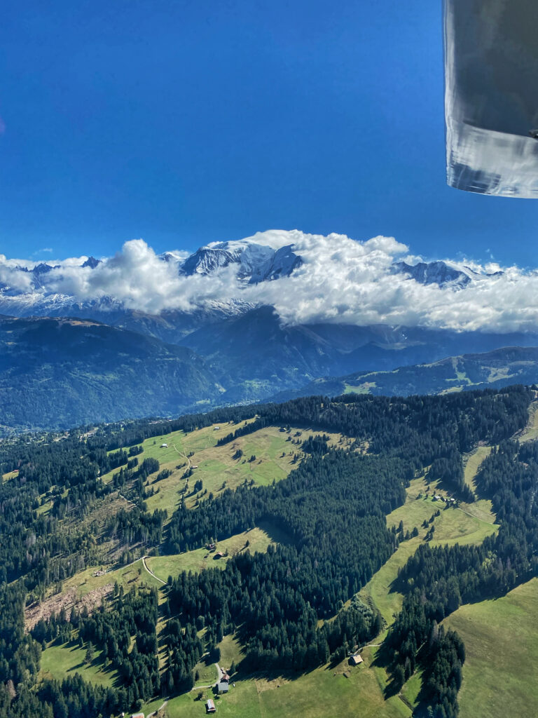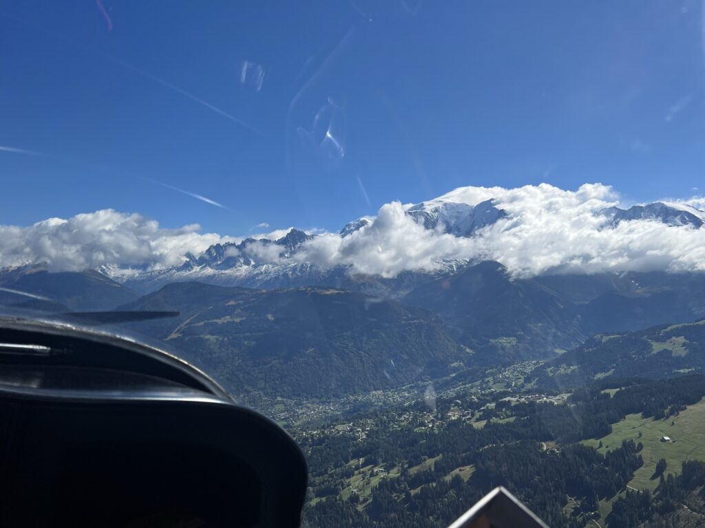 Lehké zklamání z toho, že si do zápisníku nezapíšu své první horské letiště, vzápětí vystřídalo nadšení. Horský terén poklesl, před námi se rozprostíralo velké údolí a na jeho konci Mont Blanc! Výše, než kam jsme vůbec byli schopni s naším drobkem dostoupat, napůl skrytý v mracích. Působil majestátně. Když jsem pod ním jako malý stál poprvé, ani ve snu by mě nenapadlo, že si tam jednou odpilotuji svoje malé letadlo.