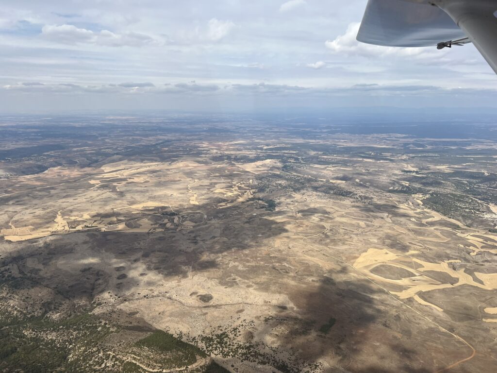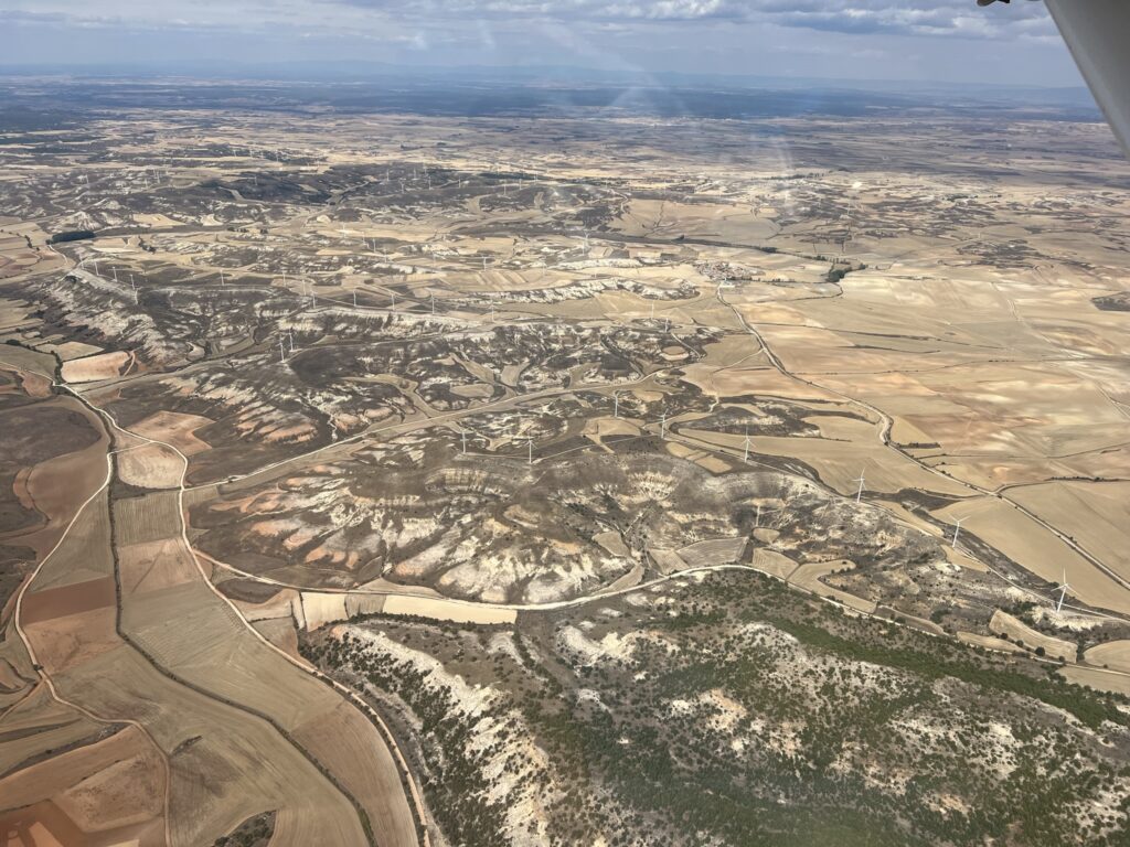 Španělský terén dokáže být zrádný. Trasu jsem měl naplánovanou mimo řízené prostory (španělské omezení pro ultralighty, přinejmenším diskutabilní) a s ohledem na výškový profil terénu – tak, abychom nemuseli do příliš vysokých kopců, kdyby se třeba mraky rozhodly ležet nízko. Trasa vedla nad zemědělským terénem mimo lesy a velká města. Jednu věc jsem ale nedomyslel…
