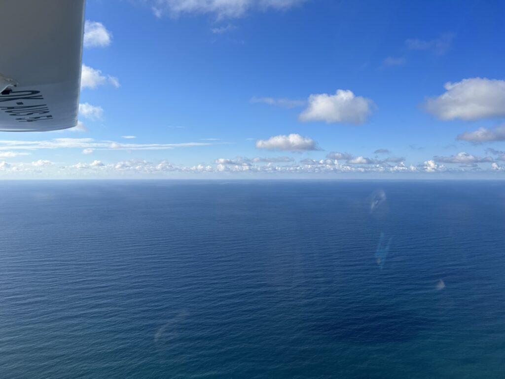Let kolem pobřeží mi způsoboval zajímavou iluzi. Bylo úplně zataženo, moře plynule splývalo s oblačností a zprava do moře klesaly vysoké kopce. Všimnul jsem si, že mě „něco“ stále tlačí do levé zatáčky. Protože totiž horizont na pohled tvořilo pouze klesající kopcovité pobřeží, snažil jsem se podvědomě rovnat s ním. Tedy pravé křídlo malinko nahoru, levé dolů.