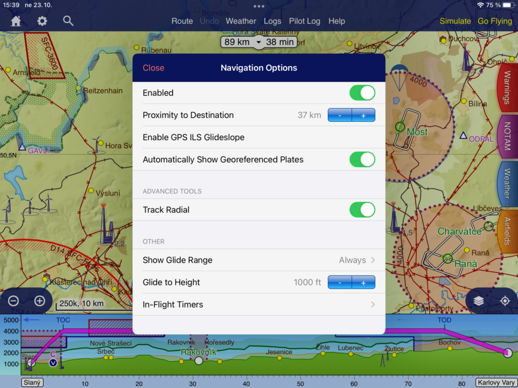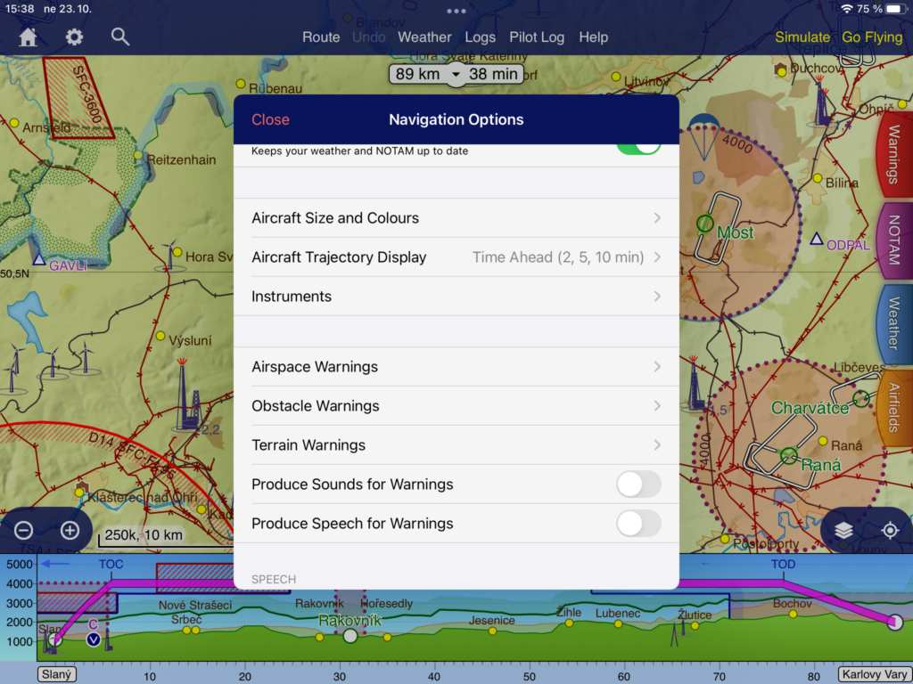 Varování na blížící se vzdušný prostor, blízkost terénu či překážky dokážou být užitečným pomocníkem, ale i nevítanou distrakcí. V Setup -> Navigation Options -> Airspace/Obstacle/Terrain Warnings tedy doporučuji předvolené limity upravit dle svých preferencí. Při krátkém VFR letu 300 metrů nad zemí v blízkosti TMA by totiž každých pár vteřin vyskakovalo nějaké varování, což dokáže být dost otravné.