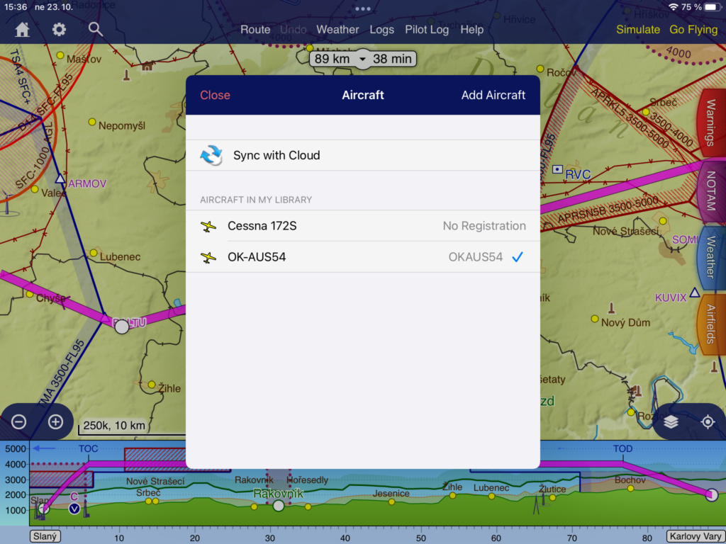 Vše se dělá v nastavení (ozubené kolečko) -> Aircraft -> Add Aircraft. Jakmile si létané typy zvolíme či definujeme vlastní, doporučuji využít možnosti Sync with Cloud. Tímto si mohu letadla synchronizovat do druhého zařízení.