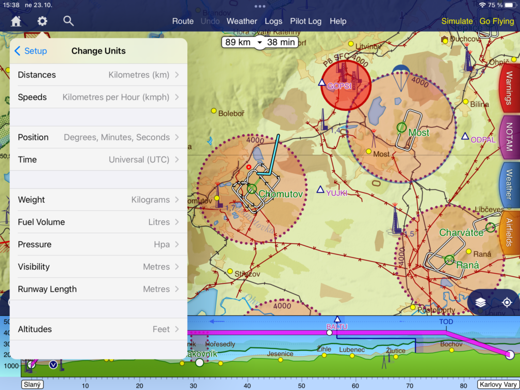 V Setup -> Change Units si volím jednotky, které pro své létání chci používat. Základní nastavení je plně vyhovující, jen u některých letadel přehazuji vzdálenosti do kilometrů a rychlosti do kilometrů za hodinu.