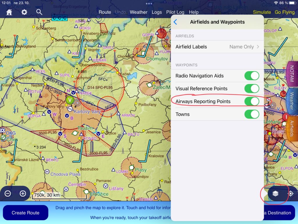 Zcela zásadní věc pro plánování delšího letu a upřímně nevím, proč není v základním nastavení zapnutá. Její aktivací si v mapě zobrazíme traťové body, které pak můžeme použít během delšího letu (udávání polohy) či během překračování hranic. Plánování po traťových bodech je stále jednodušší a pohodlnější. Řídícímu svou polohu udáme poměrně jednoduše, bez použití lokálních názvů (je daleko jednoduší říci „V blízkosti bodu BALTU“ než „kousek od vesnice Blatno“). V letovém plánu pak také vypadá daleko lépe a použitelněji „BALTU“ než „5005N01321E“.