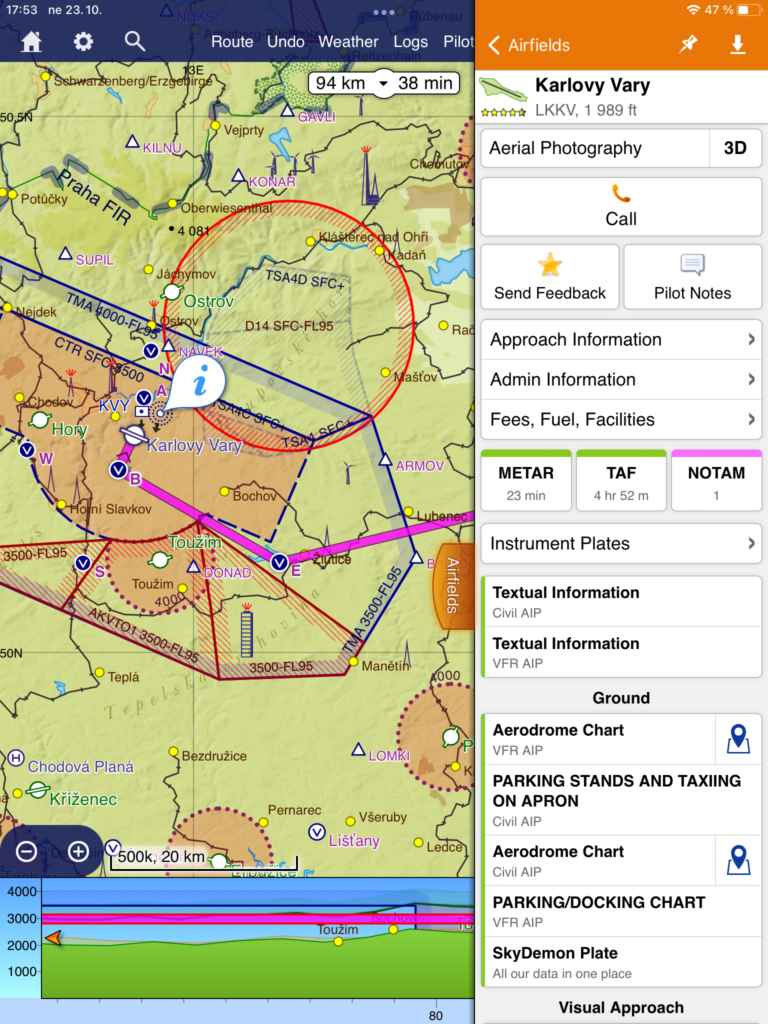 Jakmile se nacházím v detailu letiště, mám na výběr mnoho možností. V sekci Approach Information vidím údaje o drahách, výšku letiště, frekvence. Pokud má letiště METAR, umí dokonce SkyDemon dopočítat i density altitude 🙂