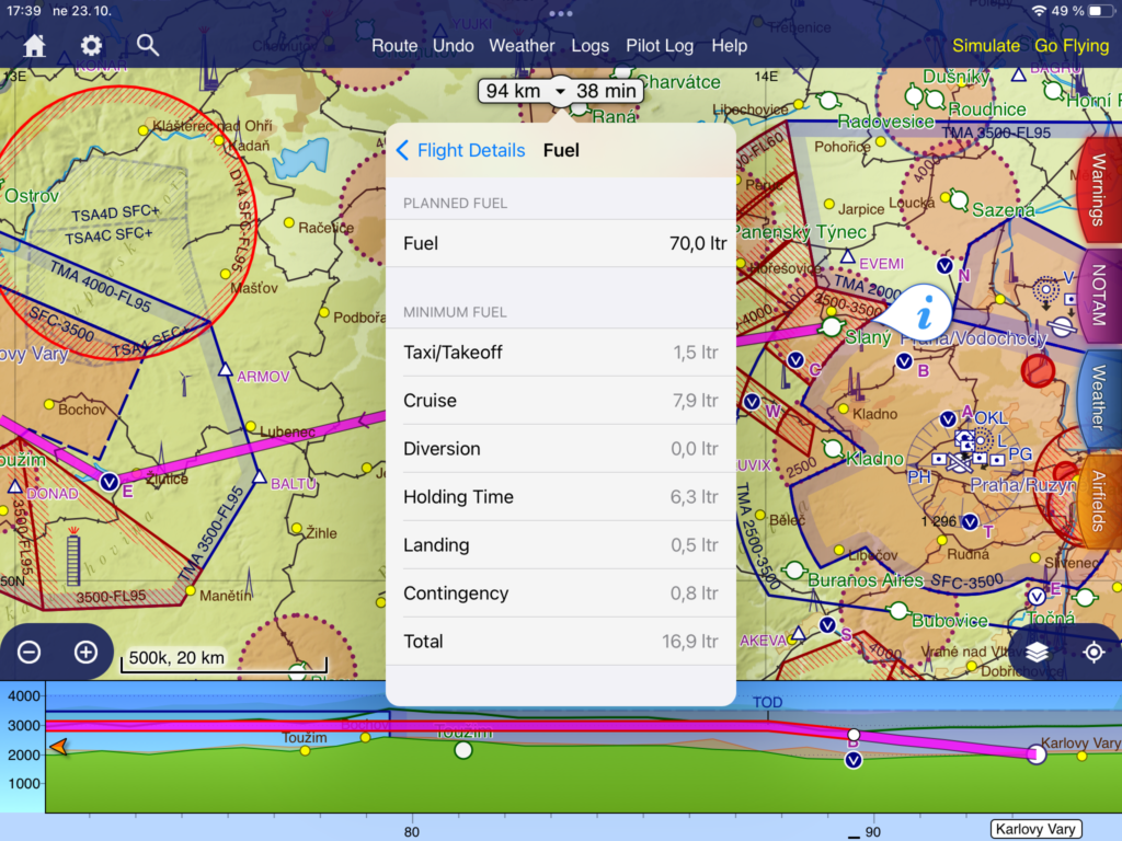 Jedná se o krátký let a z mapy vidím, že CTR Karlovy Vary končí ve 3500 stopách, kde na něj navazuje TMA. Zároveň nás po odletu ze Slaného nás pražské TMA I od 2500 ft a TMA II od 3500 ft, následované dalšími TMA s vyššími hranicemi. Abych nemusel po odletu ze Slaného vstupovat do pražského TMA, zůstanu tedy zprvu pod 2500 stop, poté pod 3500 stop. Na úrovni Rakovníka bych mohl stoupat až do FL065, ale na těch pár minut, než se přiblížím Varům, to nemá smysl. VFR přílety do Varů mají beztak zůstávat pod 3500 ft.