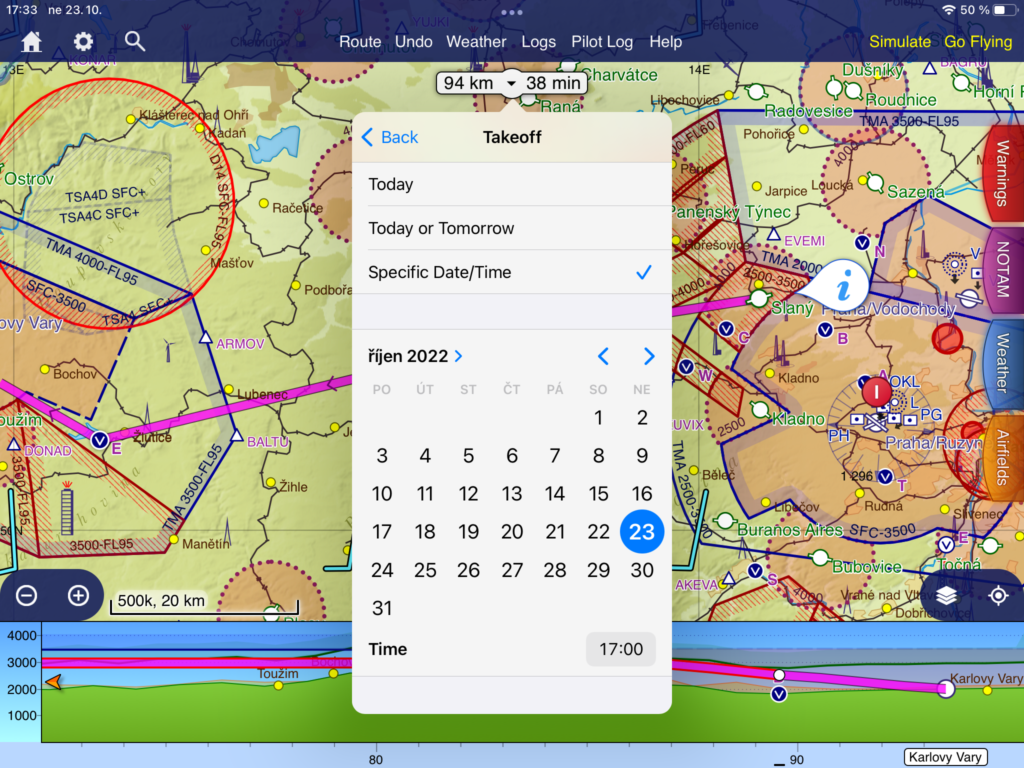 V menu „Flight Details“ – bílé menu ve vrchní části obrazovky, kde jsme nastavovali výšku letu – můžeme nastavit i dobu odletu a plánovanou rychlost letu. Na jejich základě a díky předpovědi větru pro daný čas a trasu nám SkyDemon automaticky spočítá celkovou dobu letu.